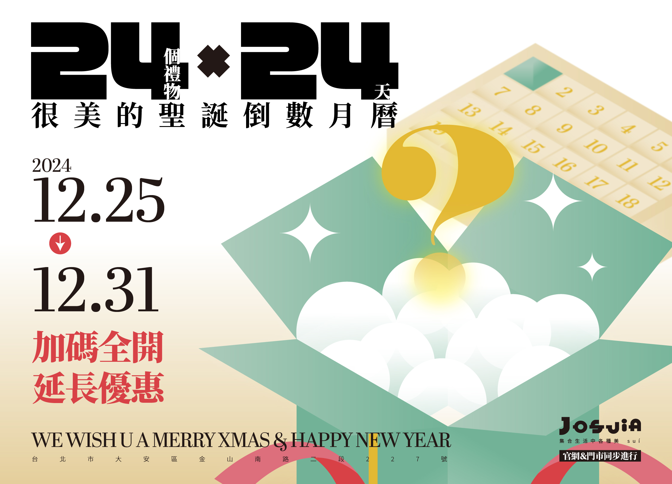 十二月,是與家人朋友分享幸福與祝福的美好時刻。JOSUIa 集合生活中的各種美,從 12/1 - 12/24 每天送上一個限定優惠物品。一天一個禮物,一天一份祝福,打開 JOSUIa 為大家準備的聖誕月曆,在最美的年末時分,讓我們一起倒數,聖誕快樂!