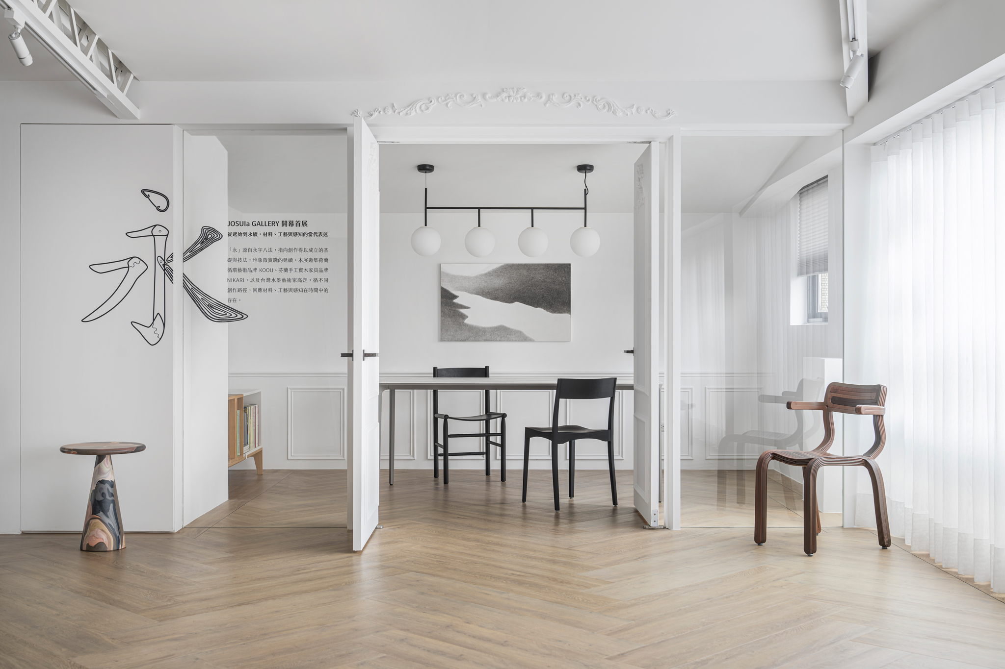 作為空間啟用後的首檔展覽,《永》邀集首次於台灣正式展出的荷蘭循環藝術品牌 KOOIJ、芬蘭手工實木家具品牌NIKARI,以及台灣水墨藝術家 高定。展覽不以單一品牌或單一媒材為呈現框架,而延續 JOSUIa 一貫所累積的空間與策展實踐,讓不同創作在場域中建立關係、展開對話,使藝術、家具與收藏不止於陳列或展示,而能更自然地融入生活。
